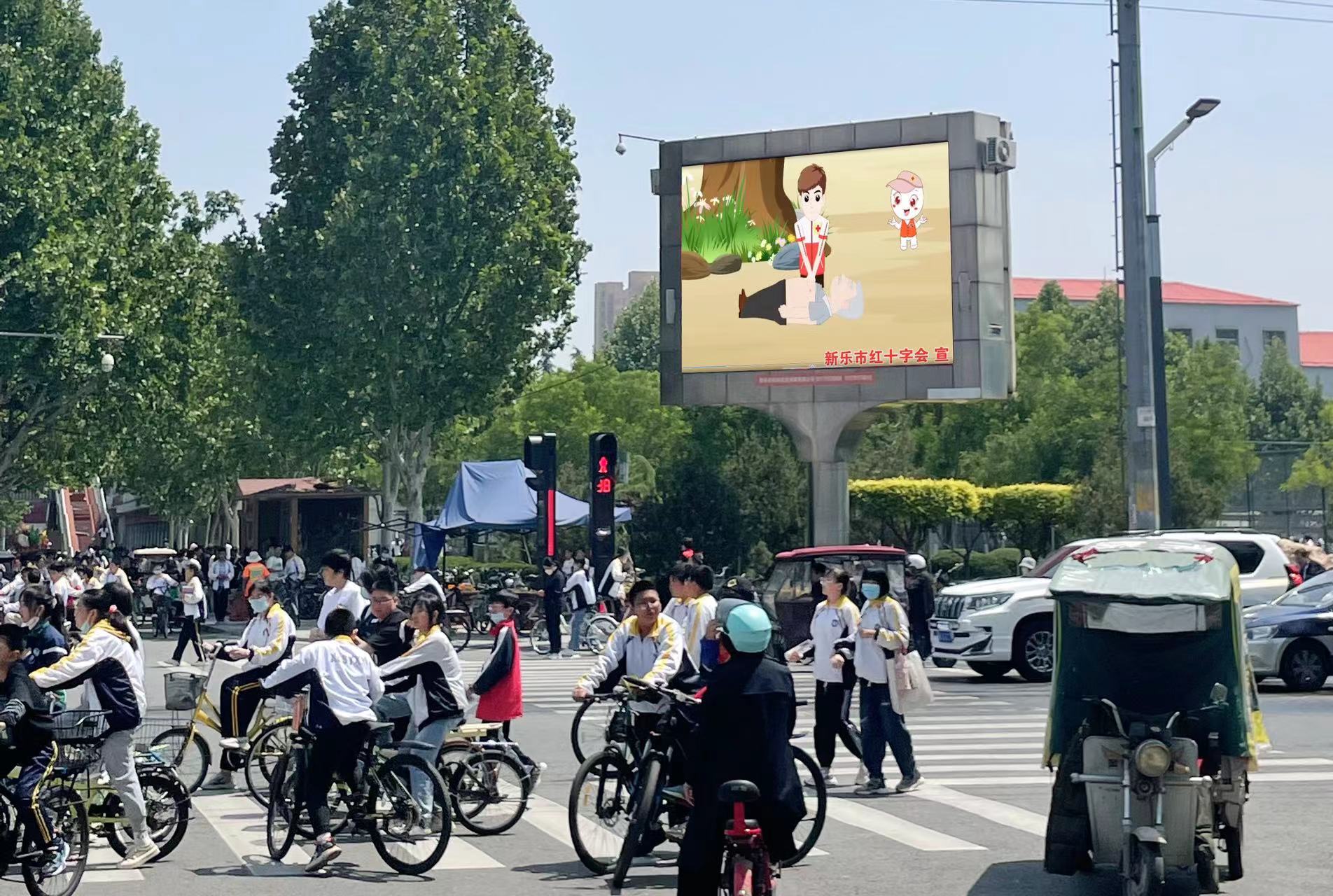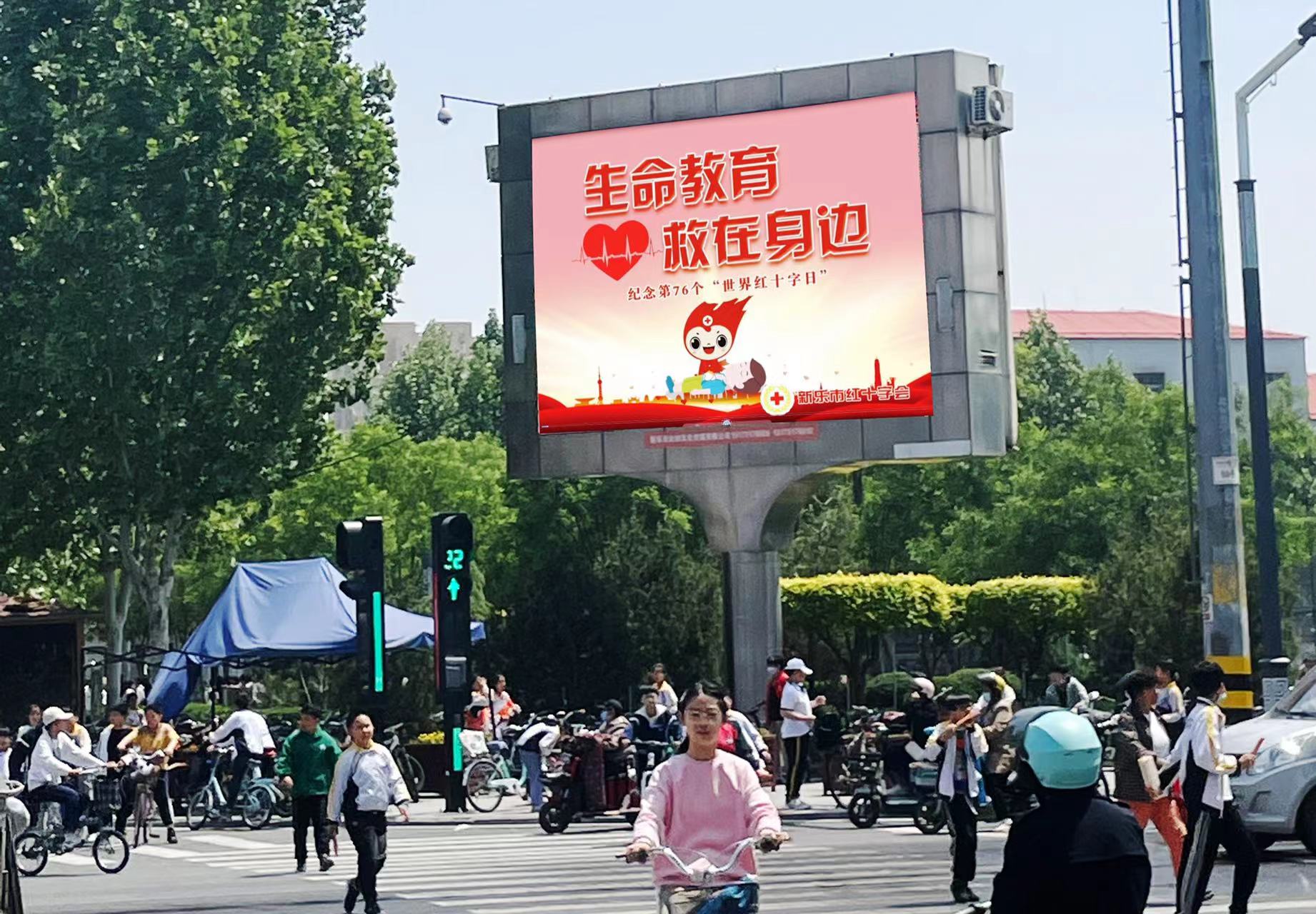 为了纪念第76个世界红十字日,弘扬“人道、博爱、奉献”红十字精神,新乐市红十字会创新工作方法,在石家庄市红十字会的精心指导和帮助下,以“生命教育 救在身边”为主题,制作了10分钟的包含心肺复苏、海姆立克急救法、创伤救护等知识的系列应急救护动画视频,于“红十字博爱周”到来之际,在人流量较大的市区文化广场,利用户外大屏对应急救护知识、世界红十字日主题等进行循环播放宣传。
