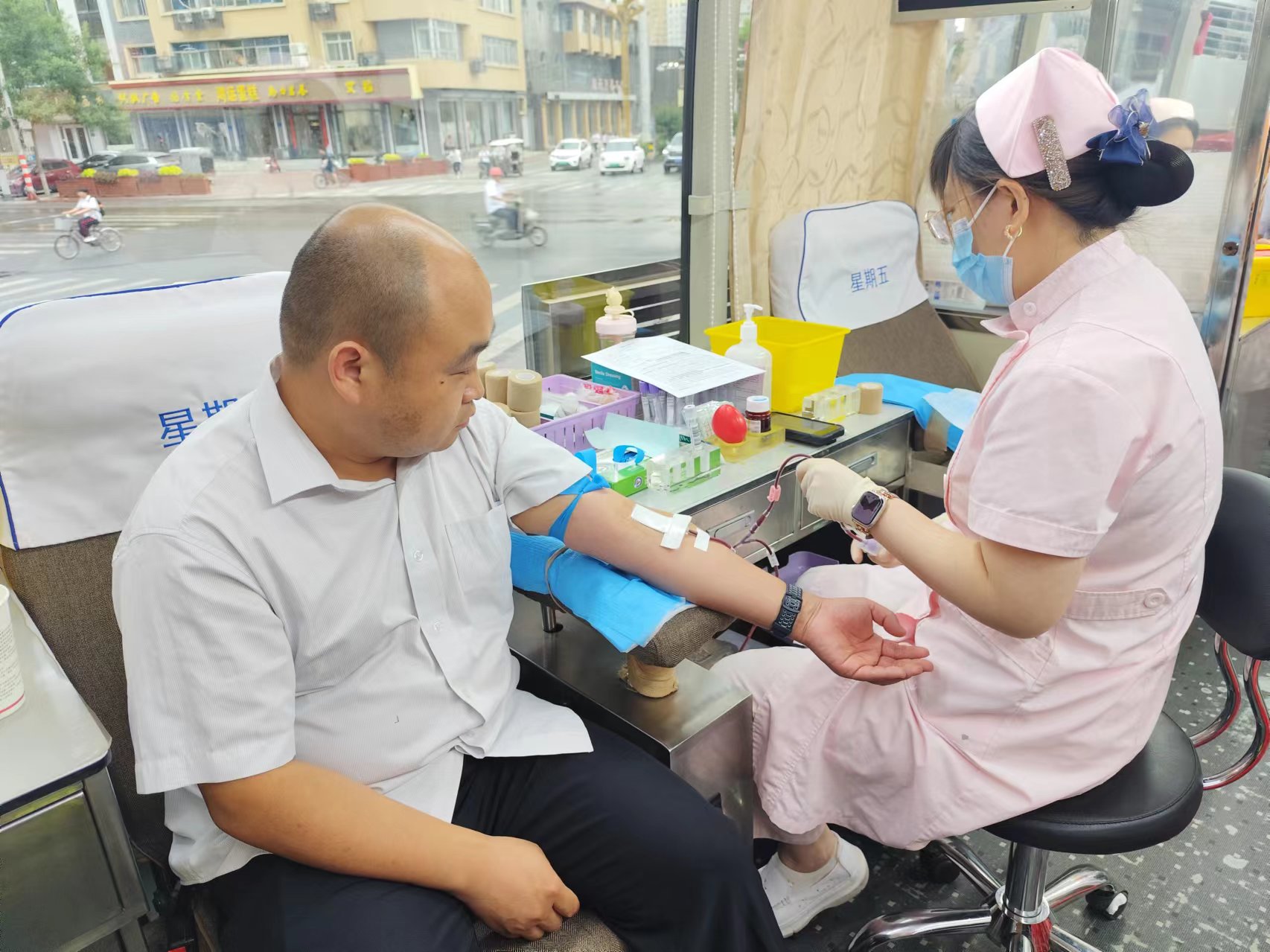 尽管天气炎热,但并没有影响市民献爱心的积极性,献血车内,前来登记献血的市民络绎不绝,大家在工作人员的引导下逐一填表登记、化验、采血,整个流程秩序井然,一管管充满爱心的热血缓缓流入储血袋。