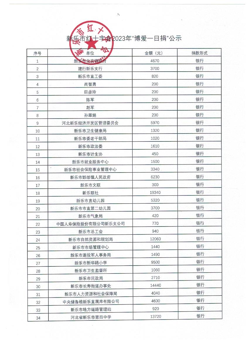 新乐市红十字会2023年“博爱一日捐”公示